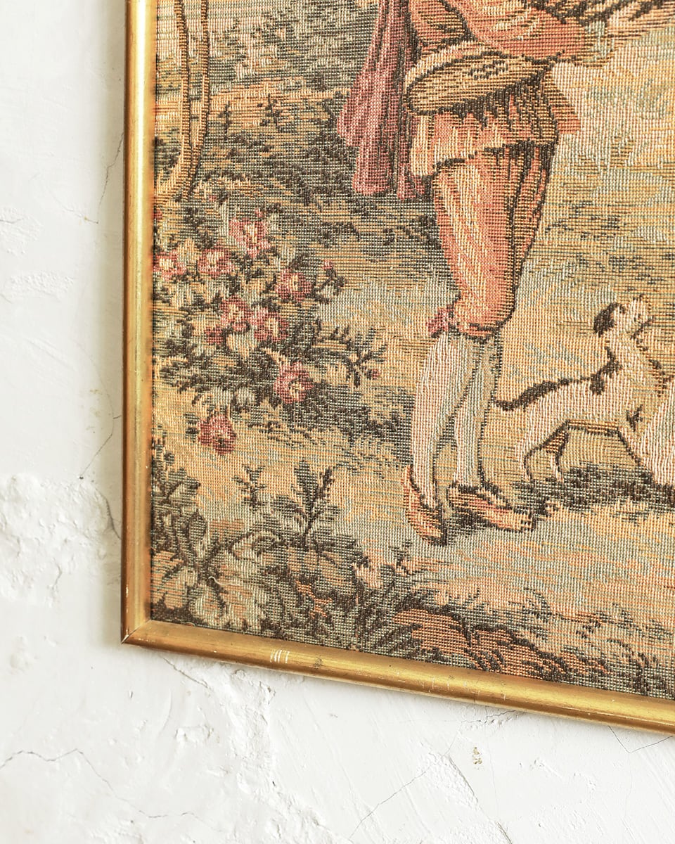 ゴールドのフレームにゴブラン織りで描かれた作品が